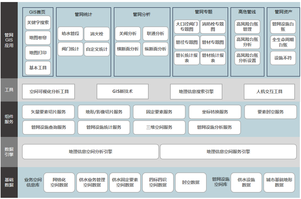 管網(wǎng)GIS應(yīng)用系統(tǒng)按照五層架構(gòu)進(jìn)行設(shè)計(jì),包含了基礎(chǔ)數(shù)據(jù)層、數(shù)據(jù)引擎層、組件服務(wù)層、工具層和管網(wǎng)GIS應(yīng)用層,完成了從數(shù)據(jù)的存儲(chǔ)到處理、分析、展示的一體化流應(yīng)用,具體架構(gòu)圖如下: