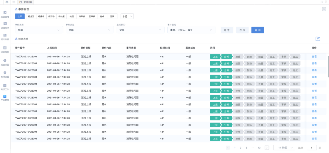 以工單管理為核心,對(duì)巡檢上報(bào)、維修搶修、居民報(bào)修、熱線上報(bào)、開關(guān)閥操作等管網(wǎng)維修養(yǎng)護(hù)事件進(jìn)行統(tǒng)一管理。